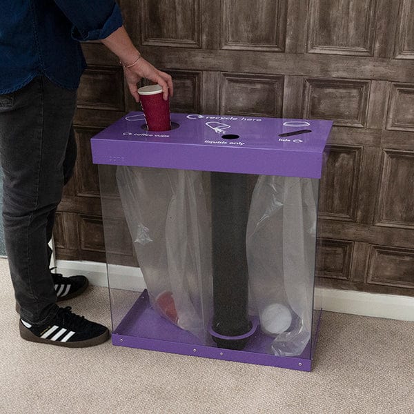 Manufactured in the UK from premium materials, this cup recycler features a plastic body, steel lid and base with a durable plastic liquid collection tube. Iconography is included as standard and the lid features a bag retention system to keep the liner in place.